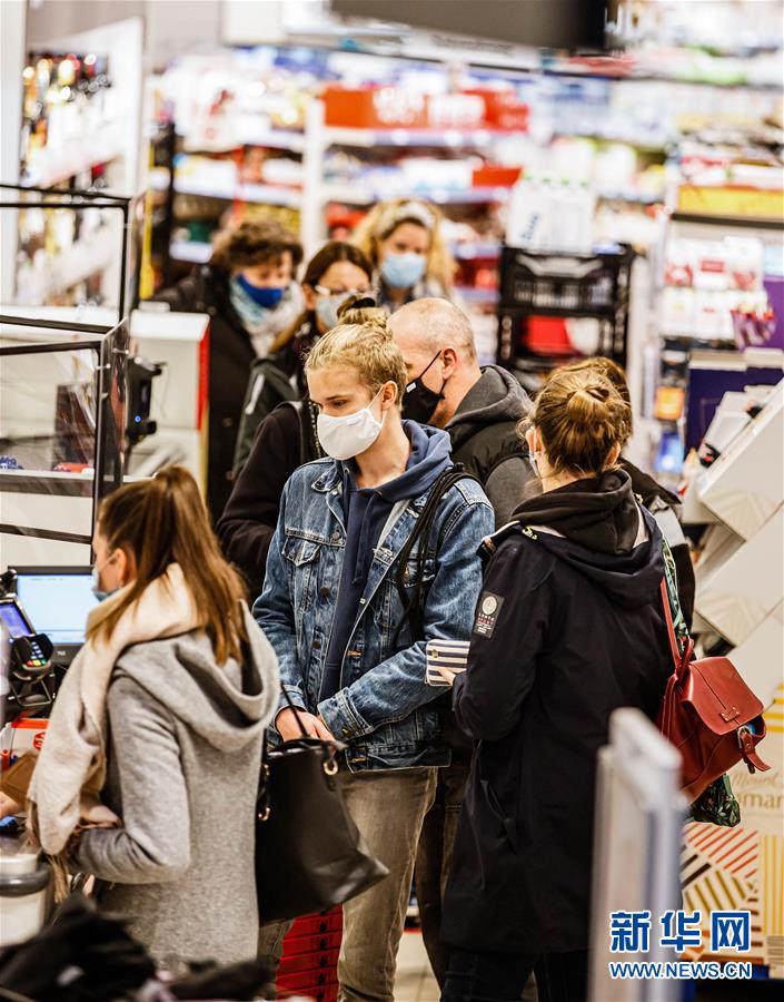 10月14日,在德国首都柏林,顾客在一家商店的收银台前排队。 德国疾控机构罗伯特·科赫研究所14日公布的新冠疫情数据显示,截至当天零时,德国较前一日新增确诊病例5132例,创4月初以来单日新增最高纪录。 新华社发
