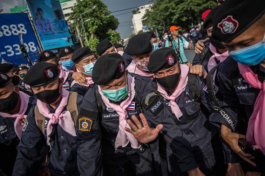 当地时间2020年10月14日,泰国反政府示威者当日傍晚冲破警方的阻拦,游行至总理府前,并在总理府外马路上安营扎寨。示威领袖称,他们将在此驻扎过夜。当天,成千上万的反政府示威者在曼谷民主纪念碑附近举行抗议集会。下午2时20分左右,集会队伍游行前往总理府,途中遭到警方层层阻拦。警方还以路中央停放大巴车、设置路障的方式阻挡游行队伍前行。经过数小时对峙,当地时间傍晚时分,游行队伍冲破警方封锁,终于抵达总理府外,并就地扎营准备过夜。图片来源:视觉中国