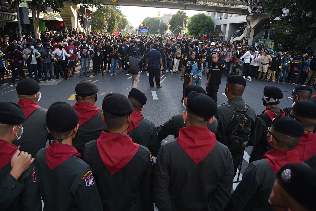 当地时间2020年10月14日,泰国反政府示威者当日傍晚冲破警方的阻拦,游行至总理府前,并在总理府外马路上安营扎寨。示威领袖称,他们将在此驻扎过夜。当天,成千上万的反政府示威者在曼谷民主纪念碑附近举行抗议集会。下午2时20分左右,集会队伍游行前往总理府,途中遭到警方层层阻拦。警方还以路中央停放大巴车、设置路障的方式阻挡游行队伍前行。经过数小时对峙,当地时间傍晚时分,游行队伍冲破警方封锁,终于抵达总理府外,并就地扎营准备过夜。图片来源:视觉中国