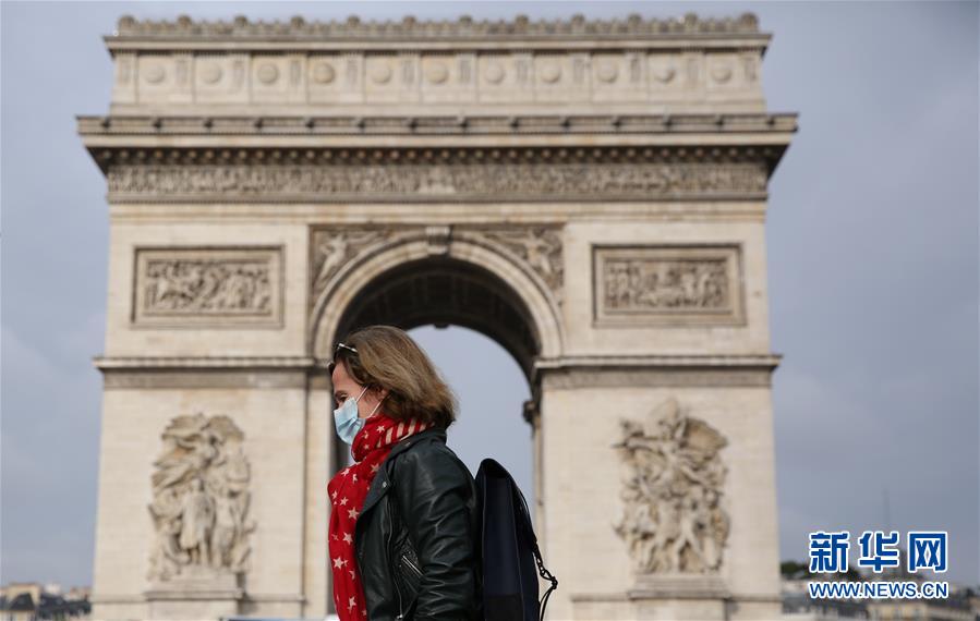 10月14日,一名戴口罩的女子走过法国巴黎凯旋门。 法国总统马克龙14日晚宣布,将从17日起在法兰西岛大区(大巴黎地区)和其他8个大城市实施宵禁,以遏制新冠疫情。 新华社记者高静摄