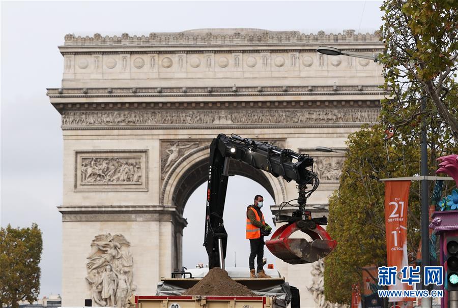 10月14日,工人在法国巴黎凯旋门附近工作。 法国总统马克龙14日晚宣布,将从17日起在法兰西岛大区(大巴黎地区)和其他8个大城市实施宵禁,以遏制新冠疫情。 新华社记者高静摄