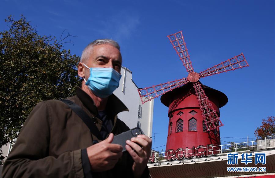 10月14日,一名男子经过法国巴黎红磨坊歌舞厅。受新冠肺炎疫情影响,红磨坊自3月13日以来停业至今。 法国总统马克龙14日晚宣布,将从17日起在法兰西岛大区(大巴黎地区)和其他8个大城市实施宵禁,以遏制新冠疫情。 新华社记者高静摄