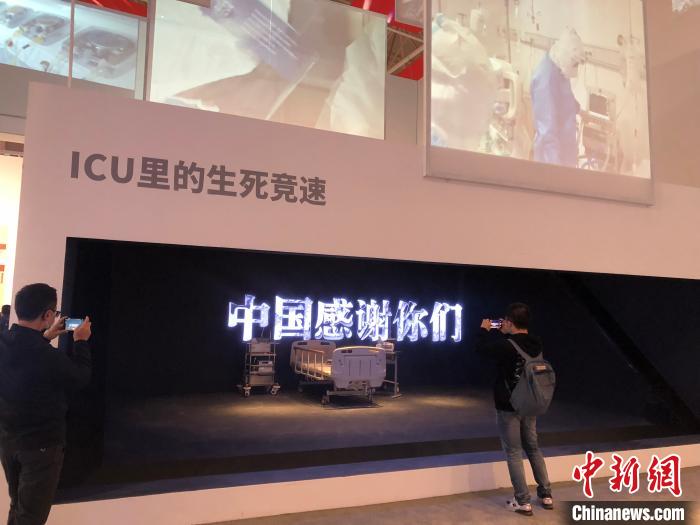 展览举办地武汉客厅,疫情期间被改建为武汉客厅方舱医院,专门用来集中收治新冠肺炎轻症患者,是武汉首批方舱医院之一。此次展览展线长1445米,展出照片1100余张、实物展品1000余件(套)、视频45个,设计大型场景33处,互动项目18处。图为幻影成像ICU展区再现了ICU病房的抗疫战。 梁婷 摄
