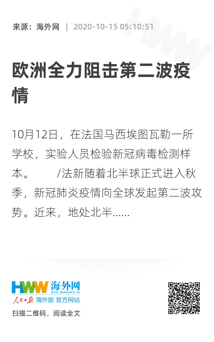“全球第二波疫情已经拉开序幕。”德新社10月11日报道称,欧洲第二波新冠疫情已经暴发,几乎所有欧洲国家的疫情都再次恶化。世界卫生组织警告,欧洲单日新增确诊病例已经突破10万例,超过美国等疫情严重国家。