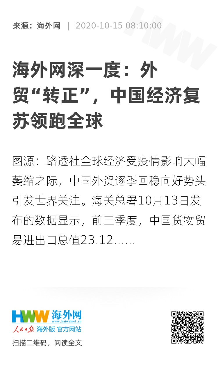 前三个季度中国的外贸增速分别为-6.5%、-0.2%和7.5%,呈现出一季度大幅下跌、二季度止跌企稳、三季度全面反弹的清晰态势。半岛电视台网站文章认为,随着中国疫情得到控制,政府出台的一系列经济扶持举措将有效提振内需。而近期人民币升值,也提高了民众的消费能力,带动了进口增长。