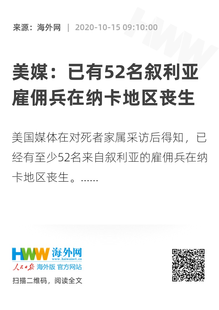海外网10月15日电 自9月底爆发新一轮冲突,亚美尼亚和阿塞拜疆在纳卡地区的交火已持续数周。美国媒体在对死者家属采访后得知,已经有52名来自叙利亚的雇佣兵在纳卡地区丧生。