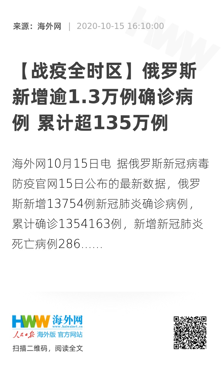 31895185,.【战疫全时区】俄罗斯新增逾1.3万例确诊病例 累计超135万例,.2020-10-15 16:04:00,.204475,.王西洛、刘强