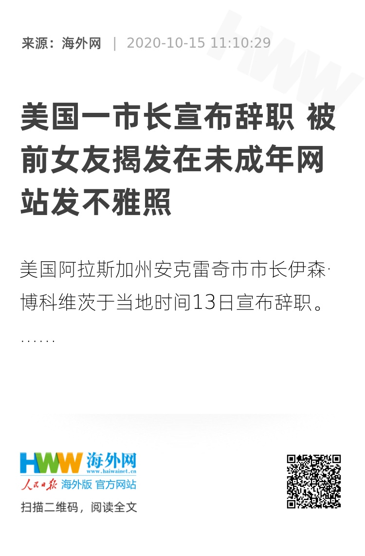 据美国商业内幕网站报道,博科维茨的发言人杰森·波肯斯泰(Jason Bockenstedt)13日发布了博科维茨的声明,声明说:“我怀着深刻的悲伤和谦卑的心情,辞去安克雷奇市市长的职务,我的辞职是不可接受的个人行为造成的,这种行为损害了我履行职责的能力,使我无法获得所需要的关注和信任。”
