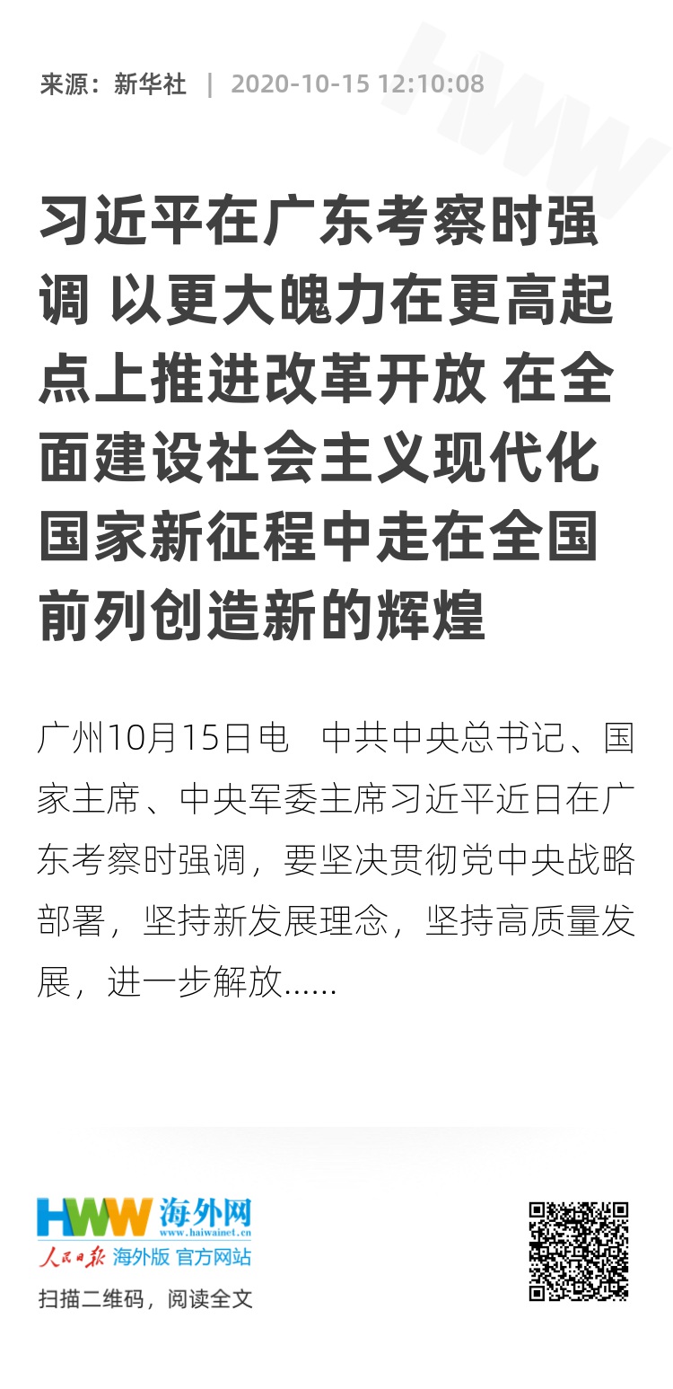 新华社广州10月15日电 中共中央总书记、国家主席、中央军委主席习近平近日在广东考察时强调,要坚决贯彻党中央战略部署,坚持新发展理念,坚持高质量发展,进一步解放思想、大胆创新、真抓实干、奋发进取,以更大魄力、在更高起点上推进改革开放,在推进粤港澳大湾区建设、推动更高水平对外开放、推动形成现代化经济体系、加强精神文明建设、抓好生态文明建设、保障和改善民生等方面展现新的更大作为,努力在全面建设社会主义现代化国家新征程中走在全国前列、创造新的辉煌。