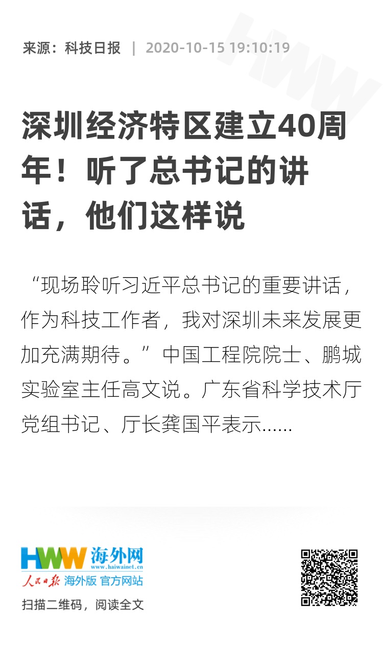 10月14日,习近平总书记在深圳经济特区建立40周年庆祝大会上发表重要讲话,强调要永葆“闯”的精神、“创”的劲头、“干”的作风,努力续写更多“春天的故事”,在科技战线引发热烈反响。