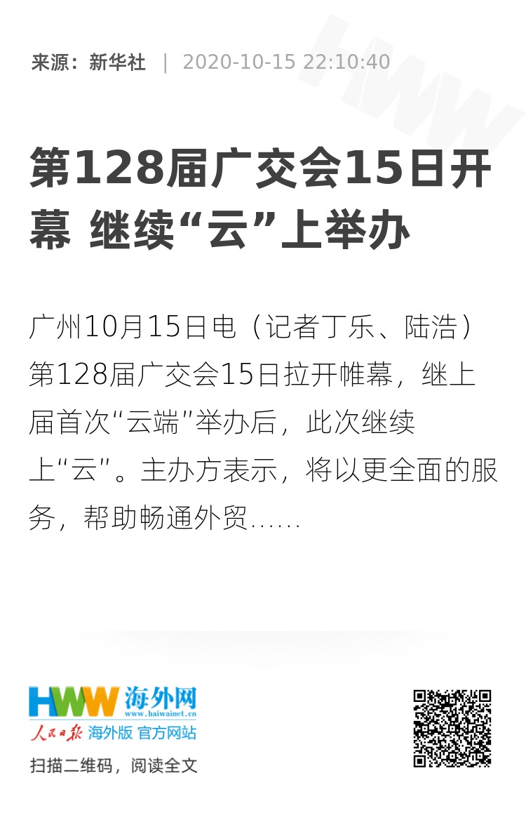 新华社广州10月15日电(记者丁乐、陆浩)第128届广交会15日拉开帷幕,继上届首次“云端”举办后,此次继续上“云”。