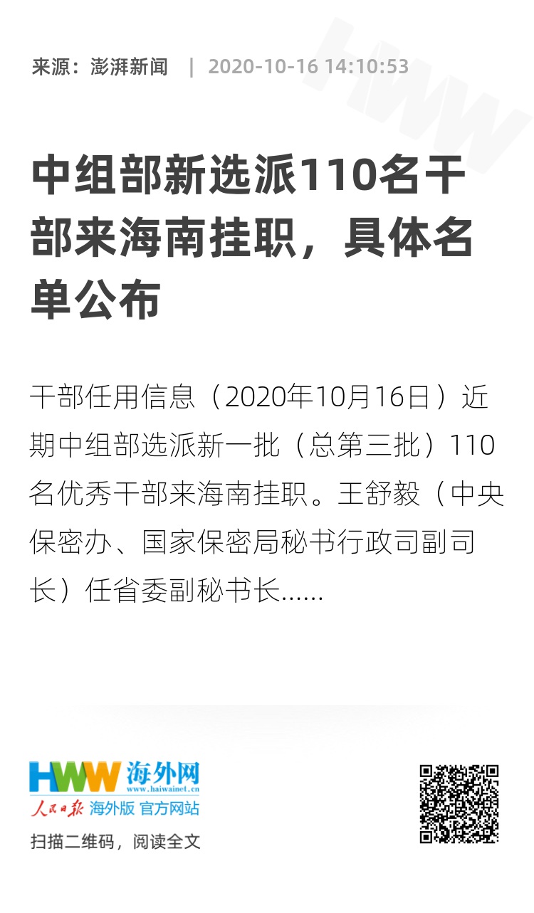 (原标题为《中组部新选派110名干部来海南挂职,具体名单和岗位来了!》)