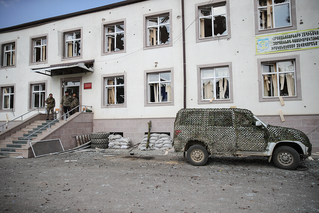 当地时间2020年10月15日,纳卡地区马尔克特(Martakert)一军队医院遭到袭击,军官和士兵对该医院进行视察。亚阿在纳卡地区爆发的冲突仍在持续。亚美尼亚方面表示,阿塞拜疆武装力量从当天清晨开始,在纳卡地区接触线恢复了炮击行动。另一方面,俄罗斯和欧盟10月14日就解决纳卡问题进行了磋商,双方强调亚阿应遵守人道主义停火规定。图片来源:视觉中国