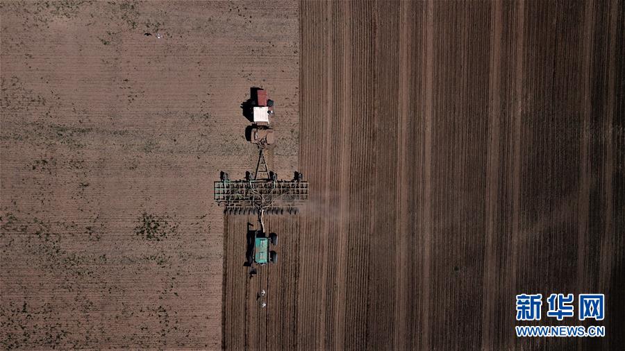 在哈萨克斯坦阿克莫拉州阿克莫尔村,农民进行小麦春播作业(2020年5月30日无人机拍摄)。 新华社发(奥斯潘诺夫摄)