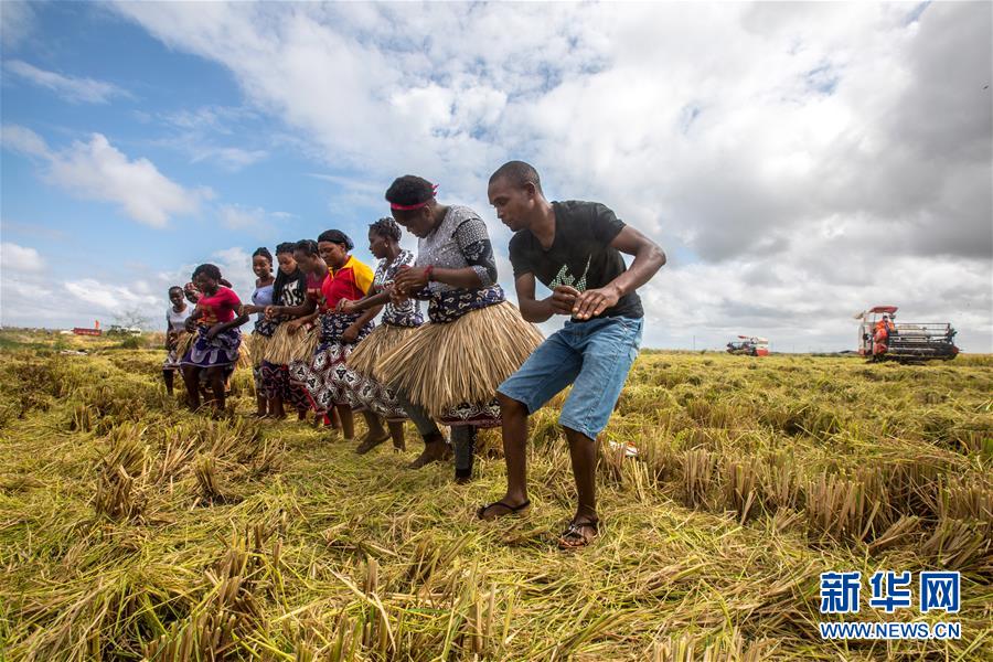 2019年4月7日,在莫桑比克万宝莫桑农业园,农户在水稻收割现场载歌载舞庆祝丰收。万宝莫桑农业园是中国在非洲最大规模水稻种植项目。得益于广袤的土地、适宜的气候、充沛的灌溉水源和来自中国的支持,项目规划开发2万公顷土地,通过合作种植方式,带动周边农户开发土地,种植水稻。由于万宝莫桑农业园在技术服务上的支持,当地粮食产量明显增加。 新华社记者 张宇 摄