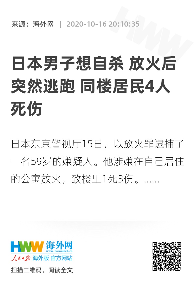 海外网10月16日电 15日,日本东京警视厅以放火罪逮捕了一名59岁的嫌疑人。他涉嫌在自己居住的公寓放火,致楼里居民1死3伤。该男子本欲自杀,他在身上和房间里涂满灯油并点火,最后自己毫发无损地逃了出来,并对警察说“没想到事情这么严重”。