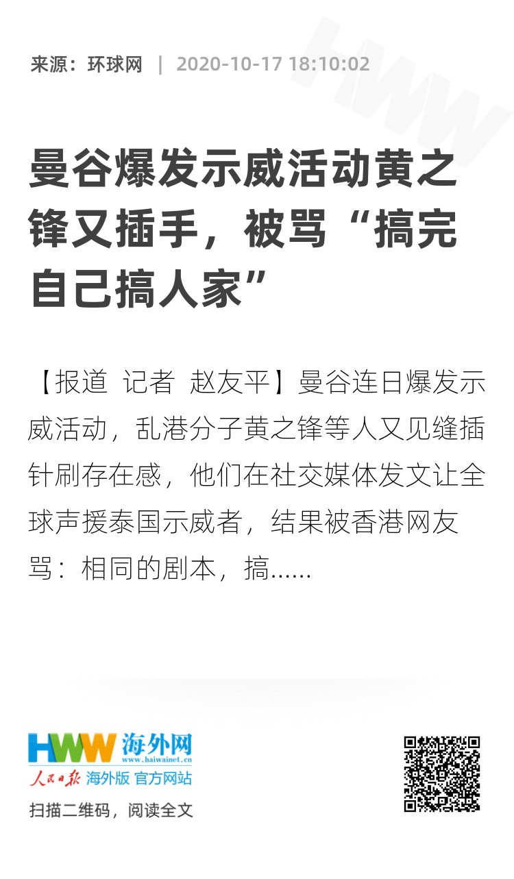 【环球网报道 记者 赵友平】曼谷连日爆发示威活动,乱港分子黄之锋等人又见缝插针刷存在感,他们在社交媒体发文让全球声援泰国示威者,结果被香港网友骂:相同的剧本,搞完自己搞别人。