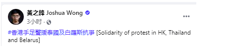 其实,早在今年8月,眼见泰国及白俄罗斯国内发生抗议活动,黄之锋当时就蹭过一波热度。8月26日,他曾在脸书发文宣称“‘香港手足’声援泰国及白罗斯抗争”。↓