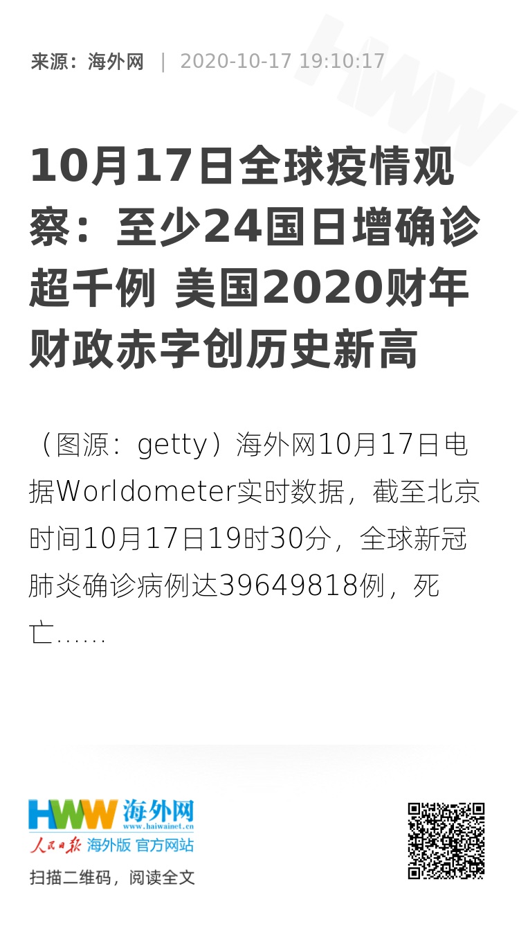海外网10月17日电 据Worldometer实时数据,截至北京时间10月17日19时30分,全球新冠肺炎确诊病例达39649818例,死亡病例1110200例。包括美国、巴西、印度、俄罗斯等国在内的至少24个国家单日新增确诊病例数均超过千例,其中印度新增62211例,美国新增73296例,巴西新增30914例。