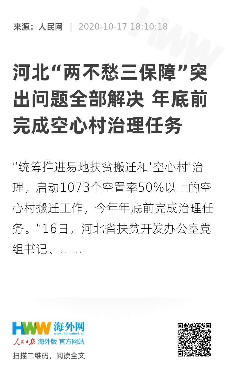 “统筹推进易地扶贫搬迁和‘空心村’治理,启动1073个空置率50%以上的空心村搬迁工作,今年年底前完成治理任务。”16日,河北省扶贫开发办公室党组书记、主任李志刚在河北省政府新闻办公室召开的新闻发布会上说,河北省贫困群众“两不愁三保障”突出问题全部解决。