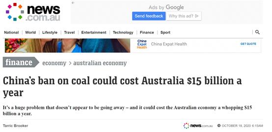“澳大利亚新闻网”:“中国的煤炭禁令”可能会使澳大利亚每年损失150亿美元