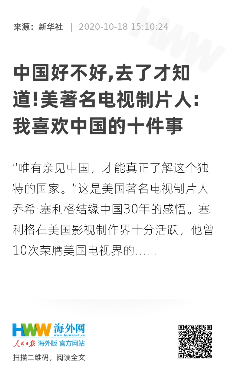 塞利格最后说,在这个充斥着网络噪音、曲解和错误信息的时代,自己唯一能相信的就是“个人的、直接的”经历。“以我过去30年的经历,中国令人印象深刻。我并不是说中国是完美的——没有哪个国家是完美的——但我想说的是,中国是一个伟大且值得我们尊敬的国家。(记者:杨士龙)