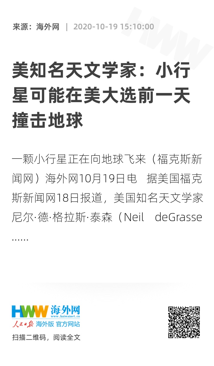 海外网10月19日电 据美国福克斯新闻网18日报道,美国知名天文学家尼尔·德·格拉斯·泰森(Neil deGrasse Tyson)透露称,一颗小行星有可能在美国大选的前一天撞击地球。不过,泰森称它只有冰箱大小,不会造成实质性的危害。
