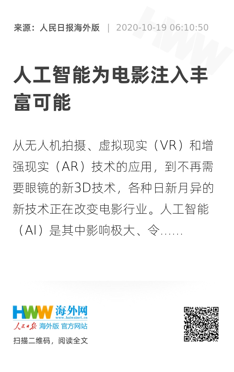 从无人机拍摄、虚拟现实(VR)和增强现实(AR)技术的应用,到不再需要眼镜的新3D技术,各种日新月异的新技术正在改变电影行业。人工智能(AI)是其中影响极大、令人印象极为深刻的技术。在整个电影生产和管理领域,人工智能所发挥的作用是全面而深刻的,电影行业的每个关键环节都因为人工智能而掀起了一股变革的浪潮。观看一部由人工智能编写剧本、设计视听效果、制作特效、自动剪辑、制定发行策略,甚至参与表演的电影,已经不再是一种未来主义的想象,而是活生生的现实。