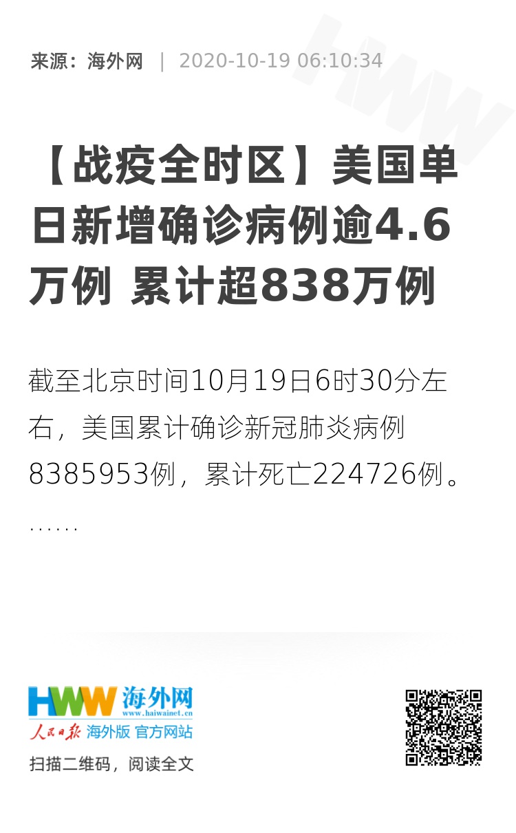 海外网10月19日电 根据Worldometer实时统计数据,截至北京时间10月19日6时30分左右,美国累计确诊新冠肺炎病例8385953例,累计死亡224726例。与前一日6时30分数据相比,美国新增确诊病例46678例,新增死亡病例470例。