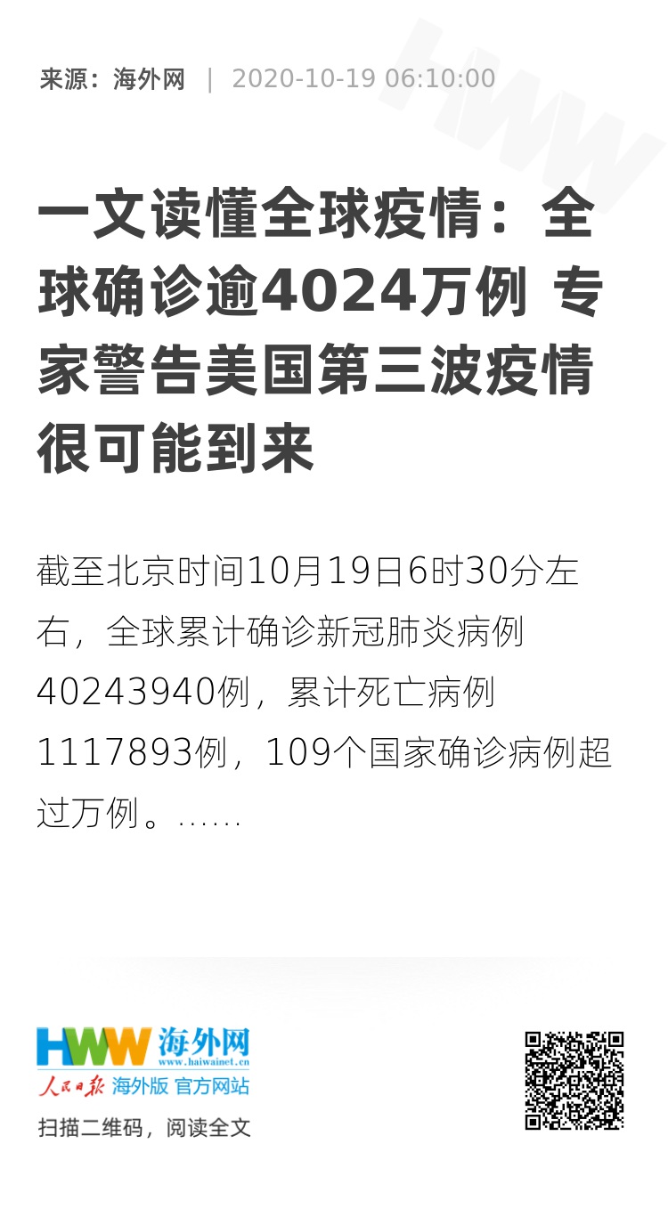 海外网10月19日电 Worldometer网站实时统计数据显示,截至北京时间10月19日6时30分左右,全球累计确诊新冠肺炎病例40243940例,累计死亡病例1117893例,109个国家确诊病例超过万例。