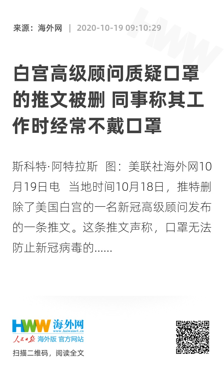 海外网10月19日电 当地时间10月18日,推特删除了美国白宫的一名新冠高级顾问发布的一条推文。这条推文声称,口罩无法防止新冠病毒的传播。