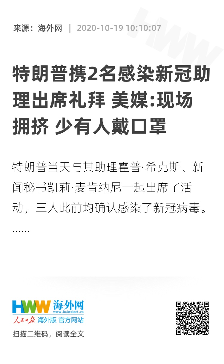 据美国有线电视新闻网(CNN)、《纽约邮报》等媒体消息,特朗普当天与其助理霍普·希克斯、新闻秘书凯莉·麦肯纳尼一起出席了活动,三人此前均确认感染了新冠病毒。活动中,特朗普从口袋中掏出了一把现金,点出几张后捐到了教堂的小桶里。