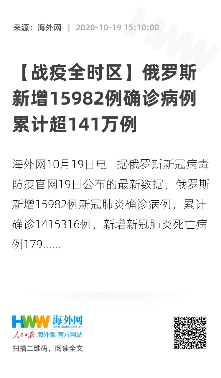 31897599,.【战疫全时区】俄罗斯新增15982例确诊病例 累计超141万例,.2020-10-19 15:46:00,.204485,.赵健行、张霓