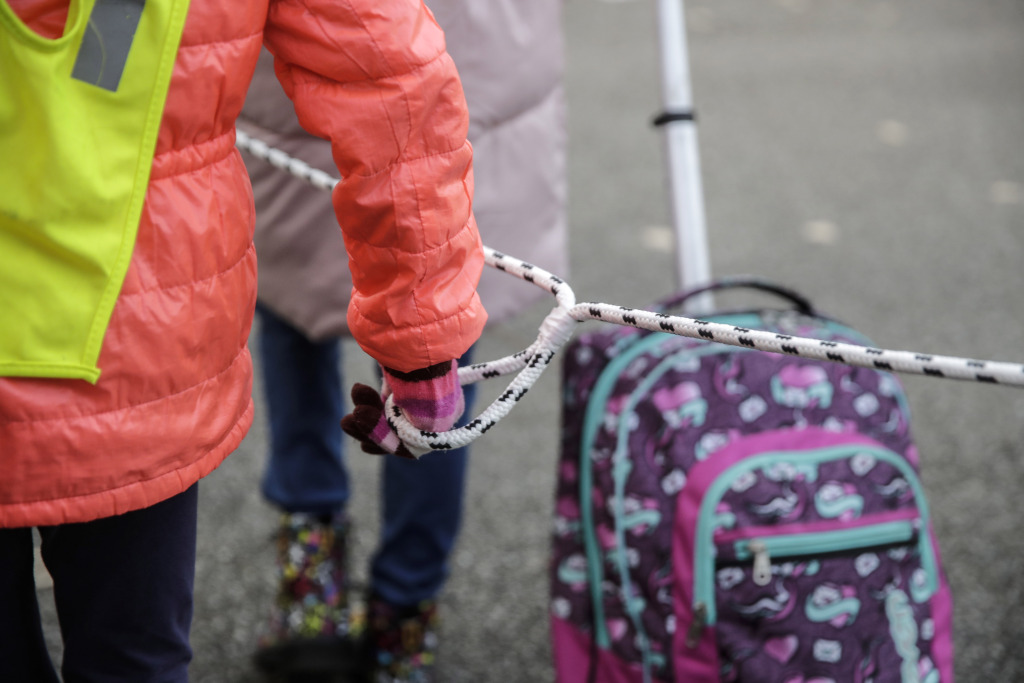 当地时间2020年10月20日,意大利北部贝卢斯科,孩子们拿着绳子保持社交距离,在志愿者的护送下走向学校。据意大利卫生部门最新发布的新冠患者住院统计资料显示,全国已有17个大区患者住院人数超过了封锁期间的数量。(供图:澎湃影像)