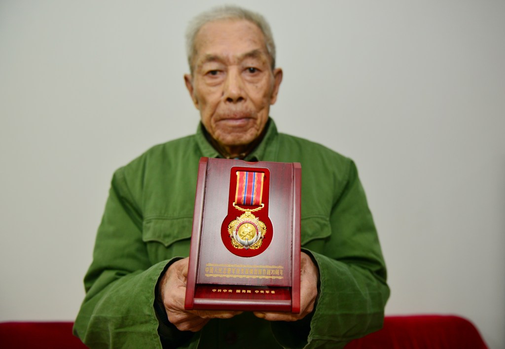 2020年10月20日,在安徽省合肥市庐阳区大杨镇建材三厂生活区,参加过抗美援朝作战工作的老战士丁兰全展示“中国人民志愿军抗美援朝出国作战70周年”纪念章。(供图:澎湃影像)