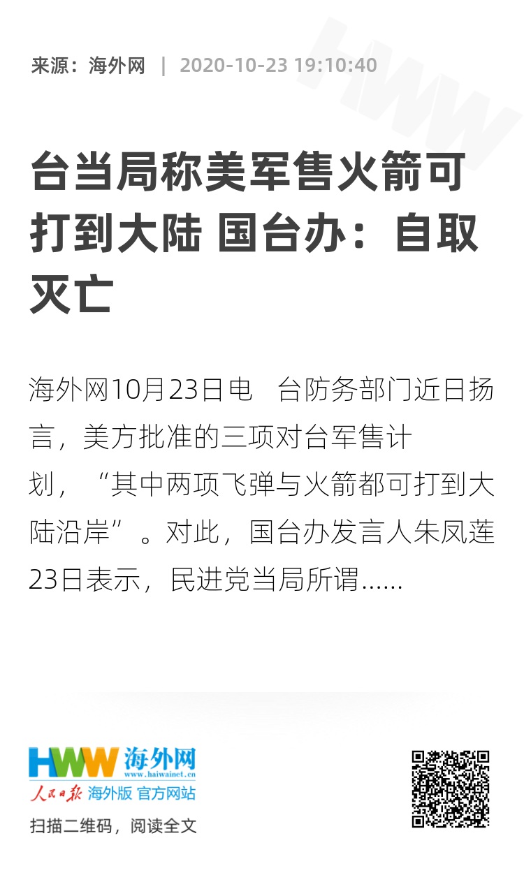 海外网10月23日电 台防务部门近日扬言,美方批准的三项对台军售计划,“其中两项飞弹与火箭都可打到大陆沿岸”。对此,国台办发言人朱凤莲23日表示,民进党当局所谓“不挑衅”的谎言再次被戳穿。他们公然对大陆进行赤裸裸的军事挑衅和威胁,不自量力,自取灭亡。