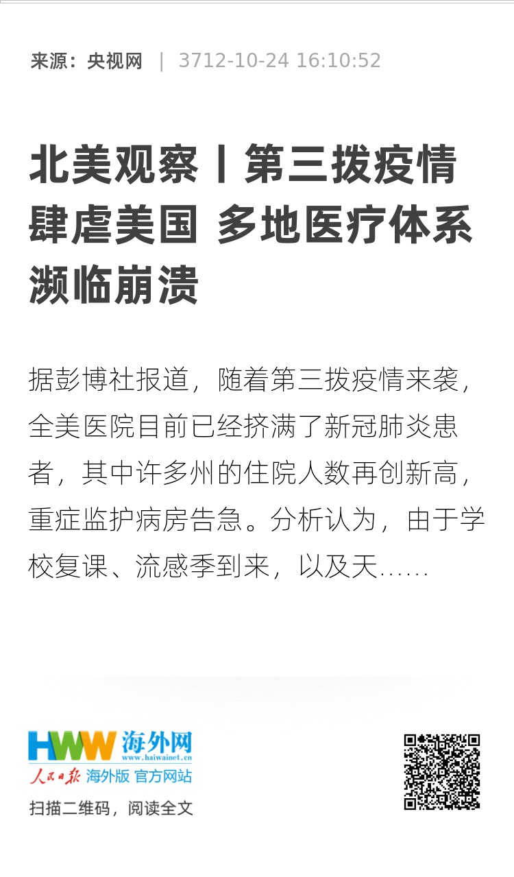 此外,各地医院在紧急收治数量暴增的新冠肺炎患者的同时,也面临着财务危机。据美国医院协会统计,全美医院在今年上半年的经济损失超过2000亿美元,预计下半年将继续亏损1200亿美元以上。截至10月16日,全美已有47家医院关停或申请破产,数百家医院被迫裁员或降薪。