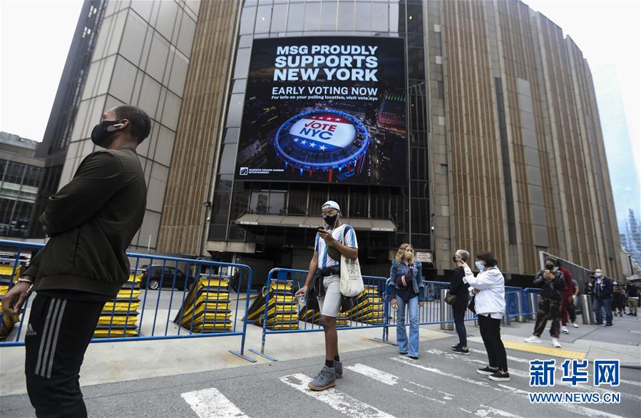 10月24日,选民在美国纽约麦迪逊花园广场投票点排队参加提前投票。 纽约州2020美国大选提前投票当日启动。美国大选投票日是11月3日,但多地已经开始提前投票。 新华社记者 王迎 摄