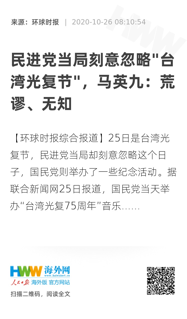 【环球时报综合报道】25日是台湾光复节,民进党当局却刻意忽略这个日子,国民党则举办了一些纪念活动。