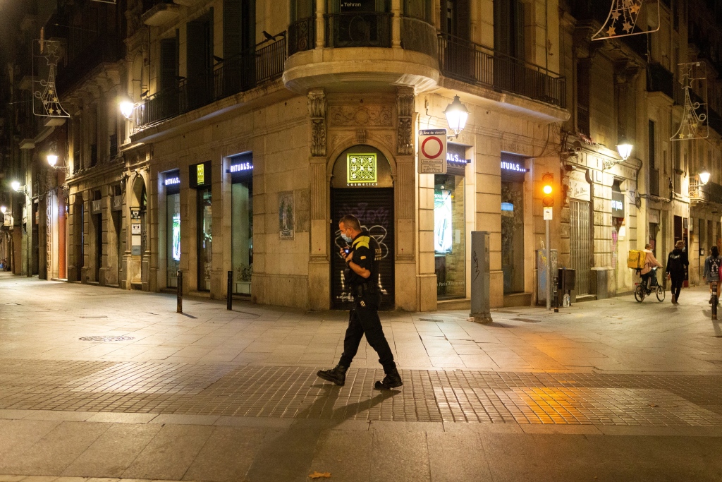 当地时间2020年10月25日,西班牙巴塞罗那,当地警方在街头巡逻,提醒民众夜间实施宵禁。图片来源:澎湃影像/东方IC