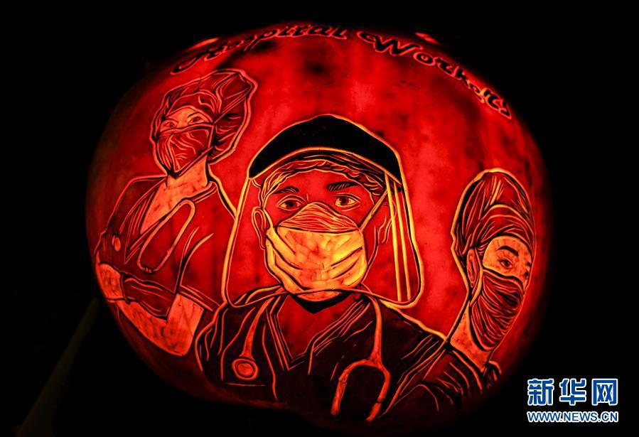 10月24日,一件南瓜雕刻作品在美国伊利诺伊州格伦科的芝加哥植物园展出。 芝加哥植物园在万圣节前举办南瓜灯展,展出1000多个手工雕刻的南瓜灯。 新华社发(乔尔·莱纳摄)