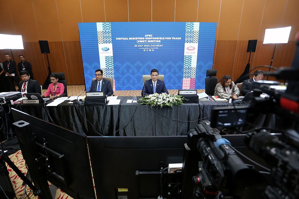 当地时间2020年7月25日,马来西亚吉隆坡,马来西亚国际贸易和工业部部长阿兹敏·阿里在贸易部长抗击新冠肺炎疫情视频会议上讲话。