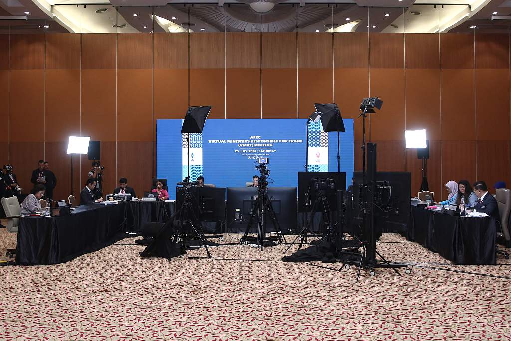 当地时间2020年7月25日,马来西亚吉隆坡,马来西亚国际贸易和工业部部长阿兹敏·阿里在贸易部长抗击新冠肺炎疫情视频会议上讲话。