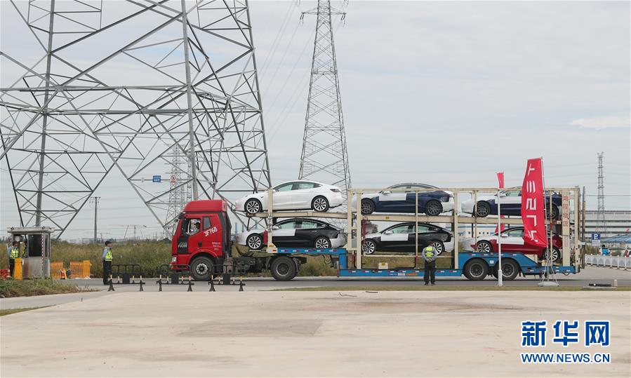 10月26日拍摄的特斯拉上海超级工厂内的Model 3汽车。 当日,全球知名汽车企业特斯拉宣布,中国制造Model 3将于10月27日首次出口欧洲,首批7000辆汽车将在11月底抵达欧洲,销往德国、法国、意大利、西班牙、葡萄牙、瑞士等国家。 新华社记者 丁汀 摄