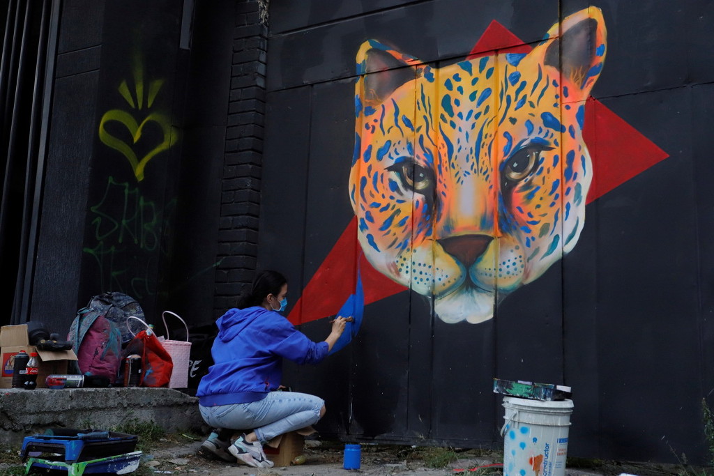 当地时间2020年10月22日,哥伦比亚波哥大,城市艺术节举行,艺术家在社区涂鸦和创作壁画。图片来源:东方IC