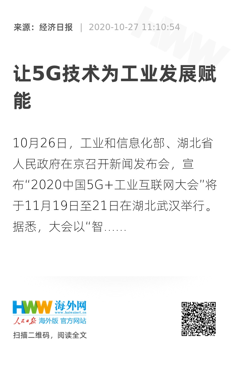 10月26日,工业和信息化部、湖北省人民政府在京召开新闻发布会,宣布“2020中国5G+工业互联网大会”将于11月19日至21日在湖北武汉举行。据悉,大会以“智联万物 融创未来”为主题,将采取线上、线下同步模式进行,旨在汇集各方智慧,共同探讨“5G+工业互联网”融合发展的思路举措,分享5G关键技术在工业领域的实践,研讨5G与人工智能、大数据、区块链等融合创新发展路径等。