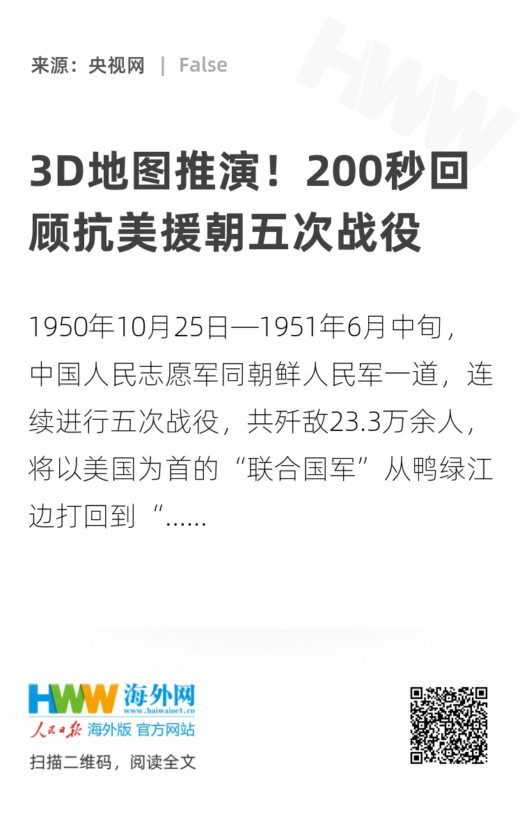 1950年10月25日—1951年6月中旬,中国人民志愿军同朝鲜人民军一道,连续进行五次战役,共歼敌23.3万余人,将以美国为首的“联合国军”从鸭绿江边打回到“三八线”,并将战线稳定在“三八线”附近地区,迫使美国接受停战谈判,为抗美援朝战争的胜利奠定了基础。点视频一起回顾这五次战役。