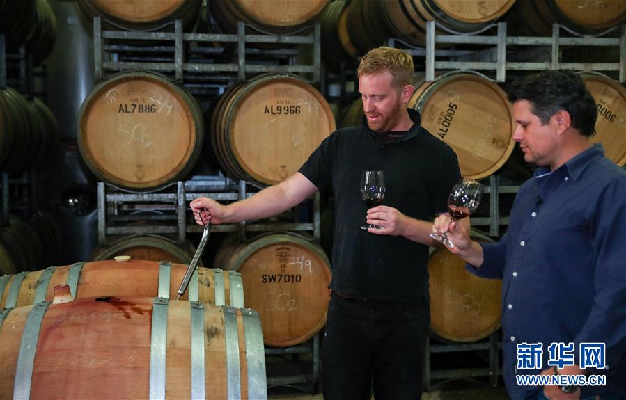 10月23日,在澳大利亚悉尼附近的尚溪红酒工厂,品牌商业经理贾斯汀·麦卡锡(右)与产品检测员检测红酒。 尚溪葡萄酒厂位于澳大利亚悉尼以北150公里处的猎人谷,是该地区较大规模的红酒制造、包装和分销商。今年是该品牌红酒首次参加中国国际进口博览会,品牌商业经理麦卡锡向记者表示,由于山火和新冠肺炎疫情暴发,该地区红酒生产普遍受到影响,他希望这里生产的高品质红酒可以借助进博会打开中国市场。 新华社记者 白雪飞 摄
