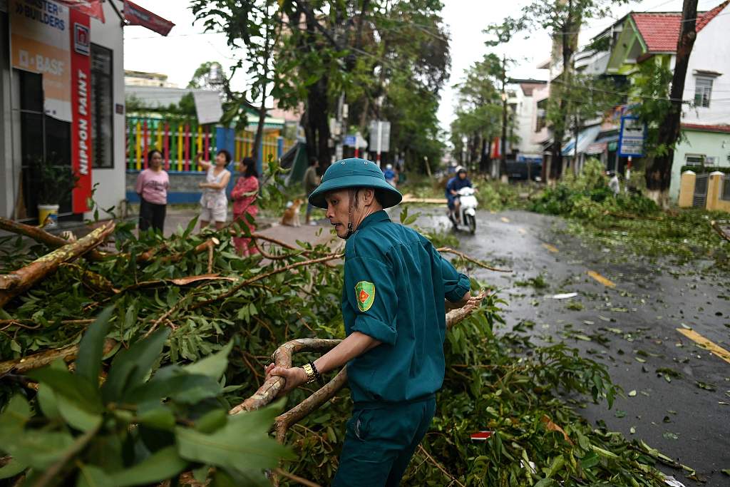 台风“莫拉菲”登陆越南 街头大树被连根拔起