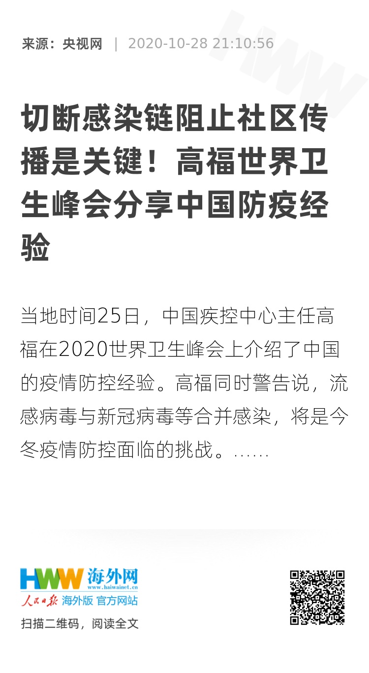 当地时间25日,中国疾控中心主任高福在2020世界卫生峰会上介绍了中国的疫情防控经验。高福同时警告说,流感病毒与新冠病毒等合并感染,将是今冬疫情防控面临的挑战。